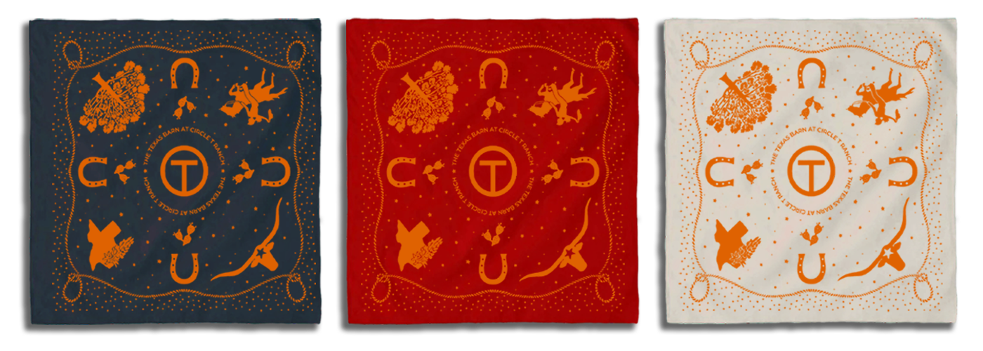 My client requested a bandana design with representative elements of both their specific region of Texas and The Texas Barn at Circle T Ranch to use as a giveaway for a commemorative Memorial Day picnic honoring first responders during the pandemic.